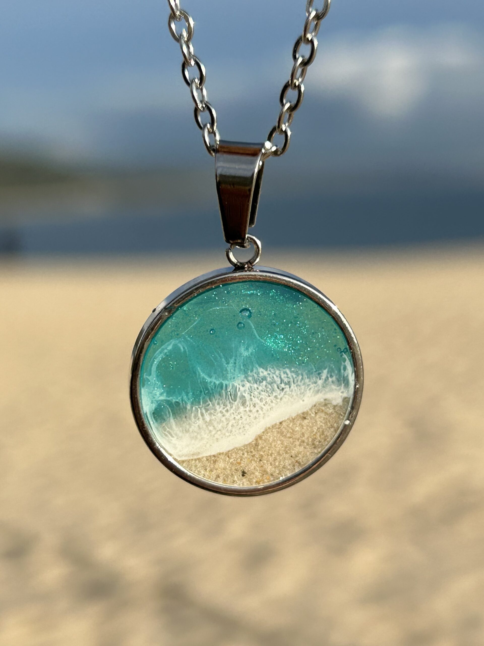 Precioso colgante de acero inoxidable y arena de las dunas de Punta Paloma. Cada pieza es diferente, no habrá una igual.